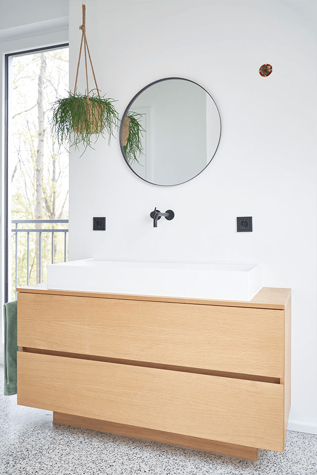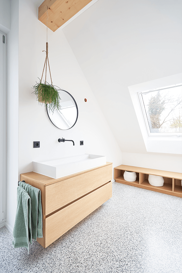 Die Kombination aus natürlicher Holzoptik und weißen Wänden erzeugt eine luftige, frühlingshafte Atmosphäre, die den Raum lebendig und einladend wirken lässt